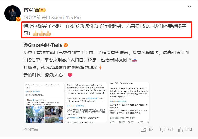 金融界6月28日消息 今日,特斯拉副总裁陶琳发微博称,历史上首次车辆自己交付到车主手中。全程没有驾驶员、没有远程操控,最高时速达到115公里,平安来到客户家门口。这是一台焕新Model Y。小米创办人,董事长兼CEO雷军转发其博文称,特斯拉确实了不起,在很多领域引领了行业趋势,尤其是FSD。“我们还要继续学习。”