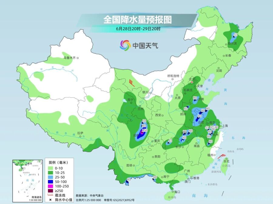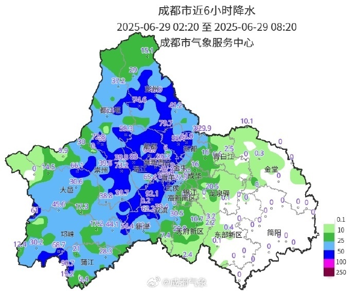 6月28日7时到29日7时总体来看,成都中西部出现雷阵雨天气,全市共计出现暴雨86站,大雨134站。最大降水量出现在郫都体育中心96.9毫米,其余区(市)县最大降水量为:温江88.5、蒲江87.9、双流85.7、都江堰70.4、崇州68、青羊区66.1、金牛区66、邛崃66、高新区64.4、大邑63.9、武侯区57.9、新津57.4、彭州54.2、新都39.6、锦江区19.9、天府新区15毫米。成都市双流、大邑、崇州、温江、新津、邛崃、高新区7个区(市)县出现瞬间最大风速大于10.8m/s(6级)的大风天气,最大风速出现在双流彭镇金河18.2m/s(8级);气温20~34.8℃。