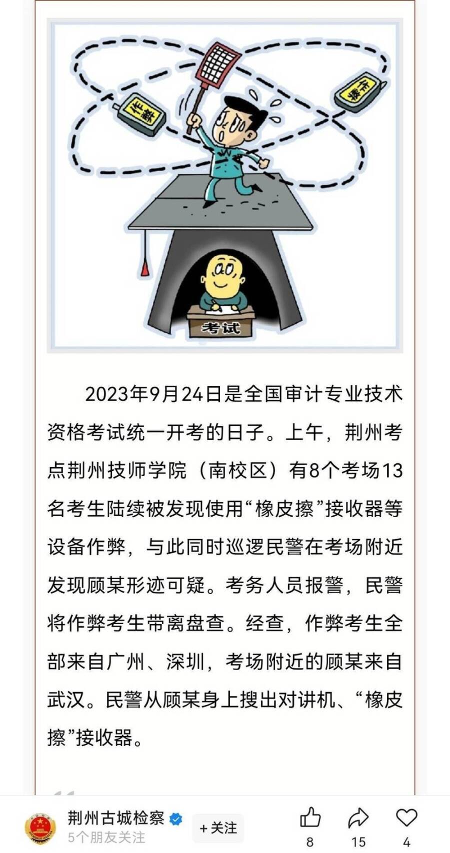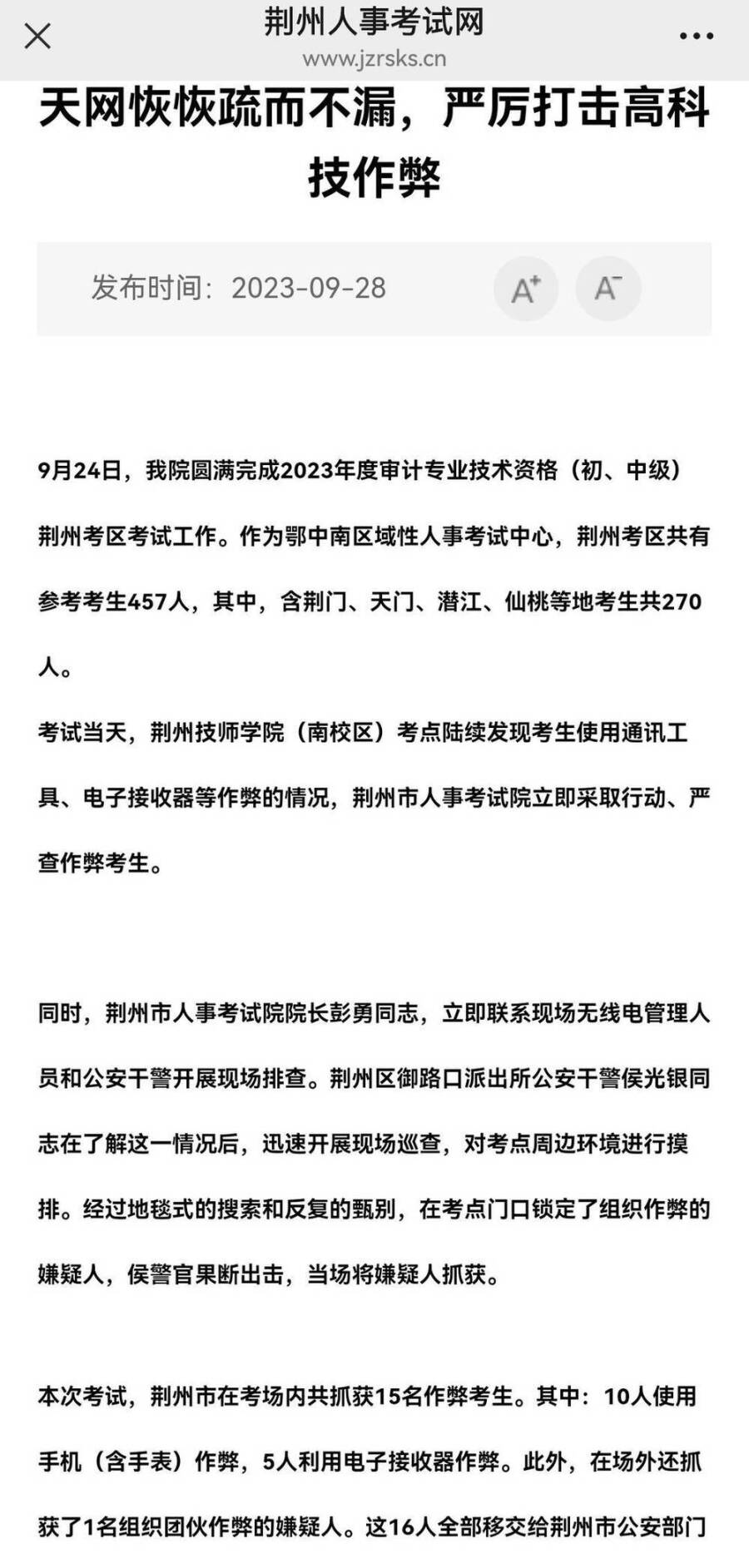 4天后,荆州人社局官网通报了这起作弊案,表示现场抓获15名作弊考生,场外抓获一名组织团伙成员。