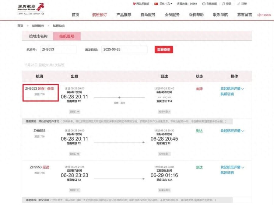深圳航空官网显示,该航班原计划6月28日晚8时从苏南硕放机场起飞,当晚10时40分抵达重庆江北机场;实际于当晚8时11分起飞,晚8时45分备降南京,晚11时23分起飞后抵达重庆。