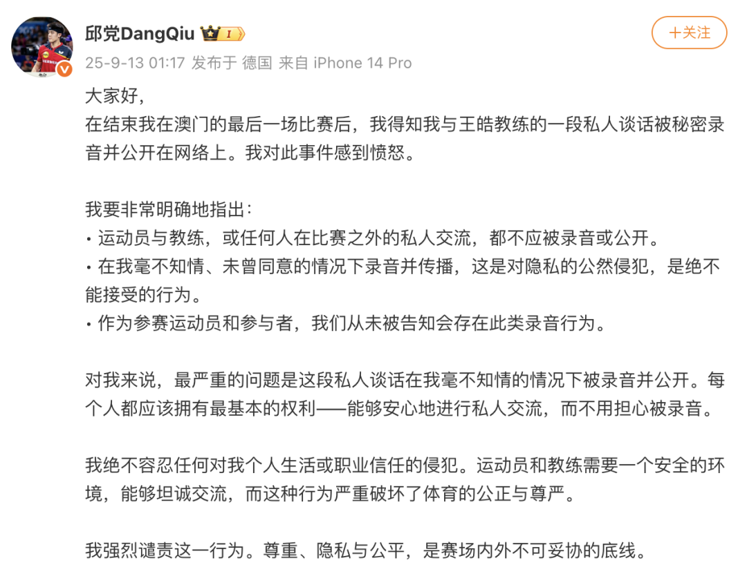大家好,在结束我在澳门的最后一场比赛后,我得知我与王皓教练的一段私人谈话被秘密录音并公开在网络上。我对此事件感到愤怒。