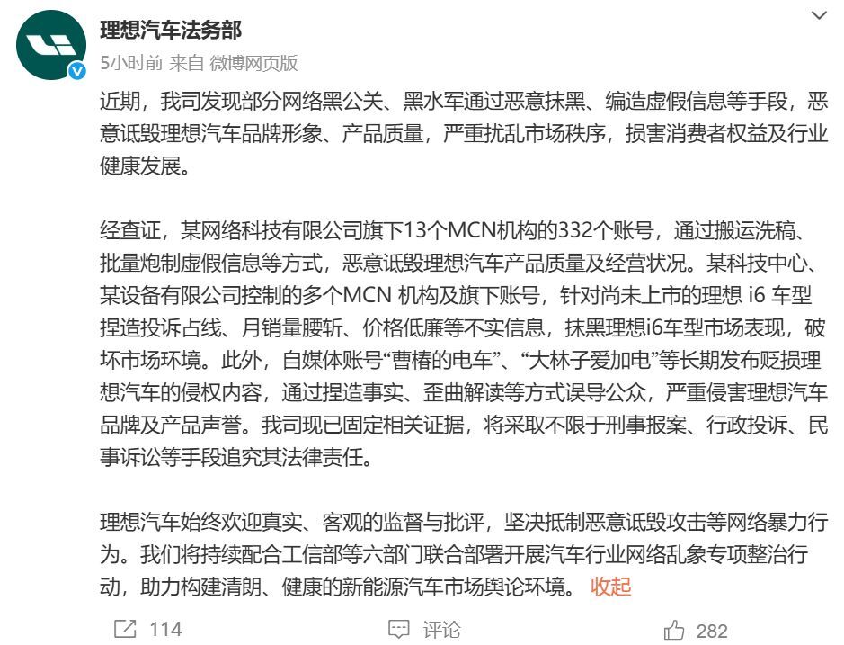 9月11日,理想汽车法务部在微博发文称,近期,我司发现部分网络黑公关、黑水军通过恶意抹黑、编造虚假信息等手段,恶意诋毁理想汽车品牌形象、产品质量,严重扰乱市场秩序,损害消费者权益及行业健康发展。