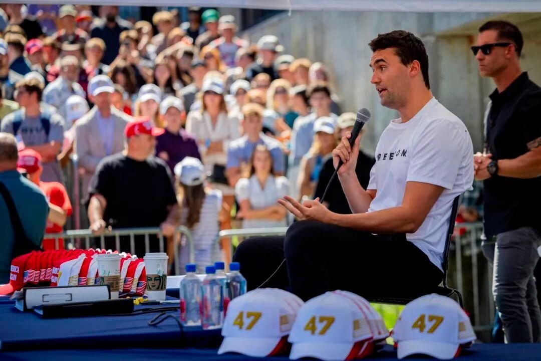 9月10日查理·柯克在美国犹他州奥勒姆市的犹他山谷大学遭枪击前发表演讲/图源:新华社