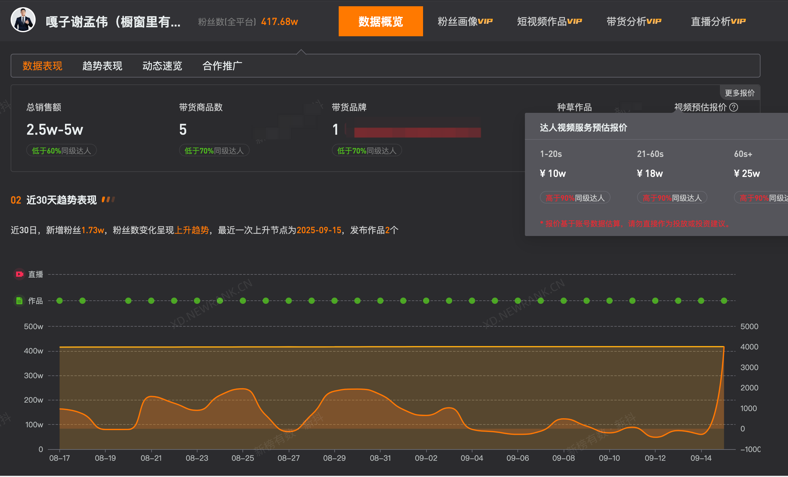 据报道,2025年9月10日,谢孟伟(嘎子哥)在云南拍戏期间,身着警察制式服装进行直播带货引发热议。第三方数据显示,谢孟伟(嘎子哥)视频平台账号1-20s视频预估报价为10万,21-60s视频预估报价为18万,60s+视频预估报价为25万。