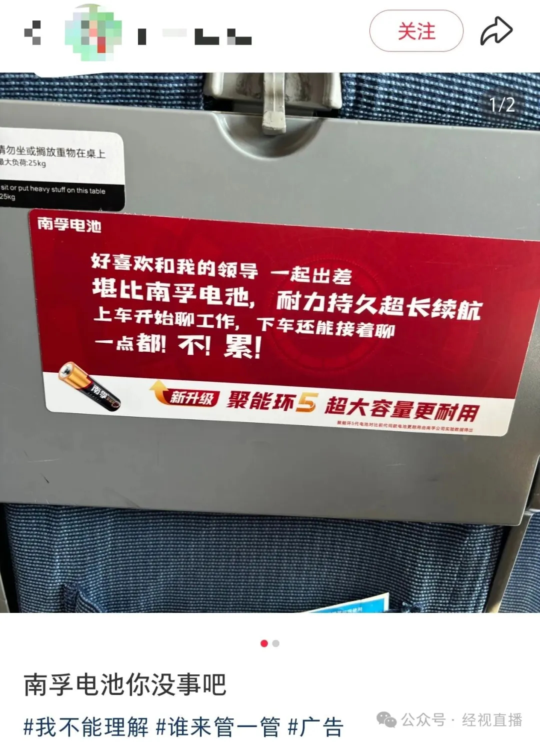 近日,一则出现在高铁座椅背后小桌板上的广告语引发关注,该广告语内容为:“好喜欢和我的领导一起出差,堪比南孚电池,耐力持久超长续航,上车开始聊工作,下车还能接着聊,一点都!不!累!”