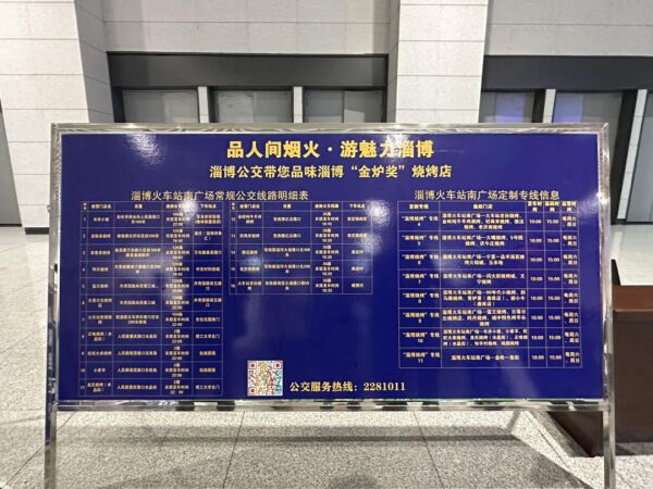 淄博火车站出站口的公交线路指示牌,清晰标明了各线路沿途知名烧烤店。新华社记者 张超帆 摄
