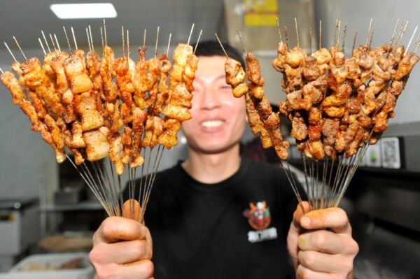 一家烧烤店的烧烤师傅将烤好的肉串递给同事。刘一鸣 摄