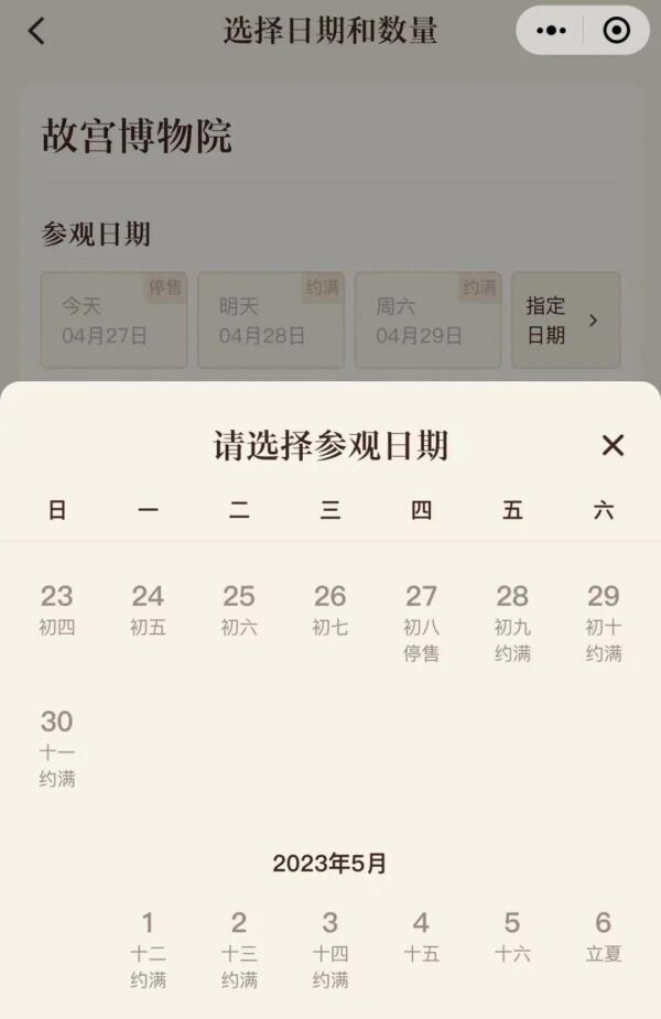 故宫博物院购票小程序显示,故宫博物院4月28日至5月3日的门票已经约满。同时,从26日开始,将午门外东侧的“综合服务窗口”移至端门西侧“票务服务窗口”。