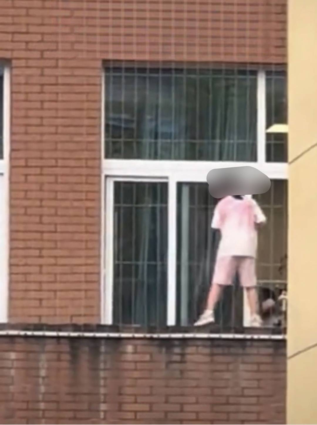 网友发布的视频截图显示:一小学生在窗台上打扫。图据网友视频