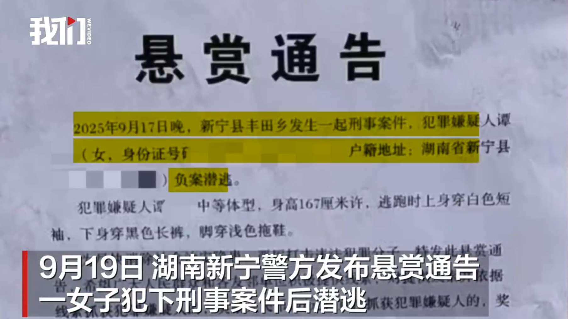 9月19日,湖南新宁警方发布悬赏通告称,17日一女子犯下刑事案件后潜逃。