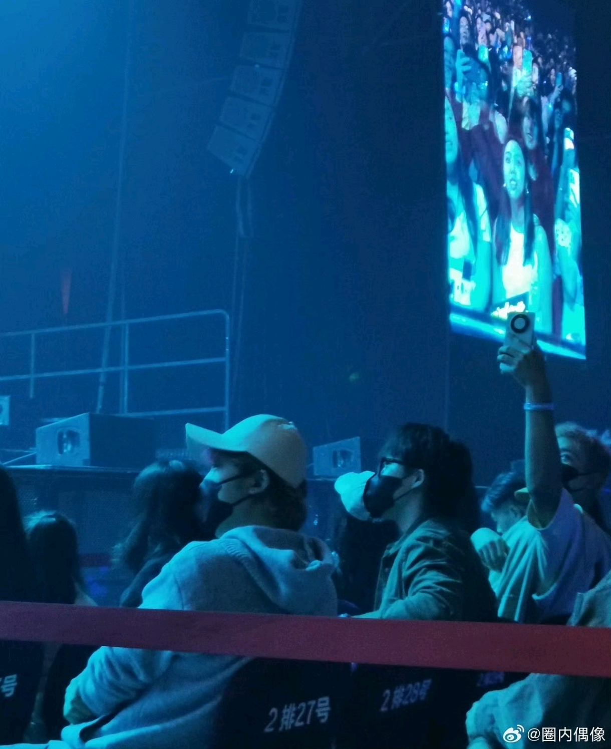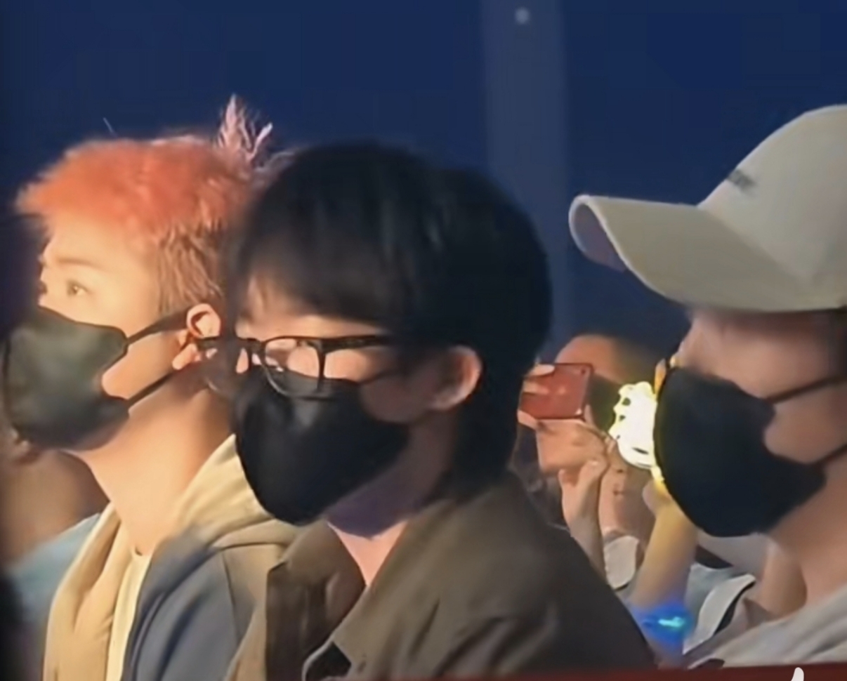 王楚钦不是一个人来的,当然少不了他的“左膀右臂”王晨策、曹巍,据说还有肖战指导的儿子肖凯文。前三人并排坐在一起,王楚钦戴着眼镜和口罩,跟着节奏摇头晃脑地唱了起来,非常投入。
