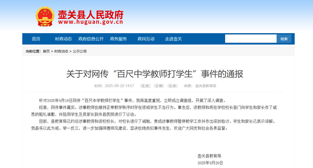 针对2025年9月19日网传“百尺中学教师打学生”事件,我局高度重视,立即成立调查组,开展了深入调查。