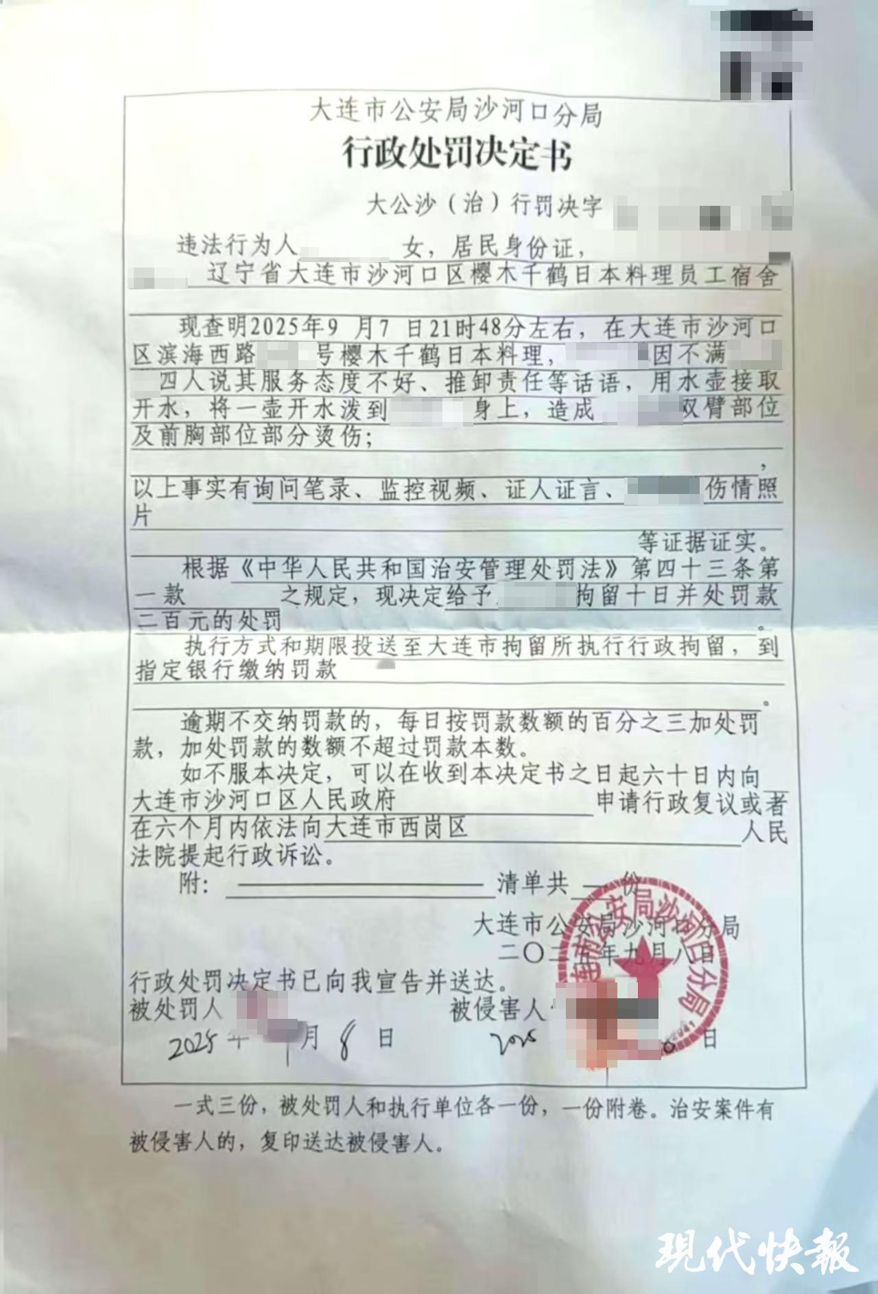 据9月8日大连市公安局沙河口分局出具的《行政处罚决定书》,经查明,9月7日晚9时48分左右,在大连市沙河口区滨海西路一日本料理店,该服务员因不满小沫等四人说其服务态度不好、推卸责任等话语,用水壶接取开水,将一壶开水泼到小沫身上,造成小沫双臂部位及前胸部位部分被烫伤。依据《治安管理处罚法》,警方给予该服务员行政拘留10日,并处罚款200元。
