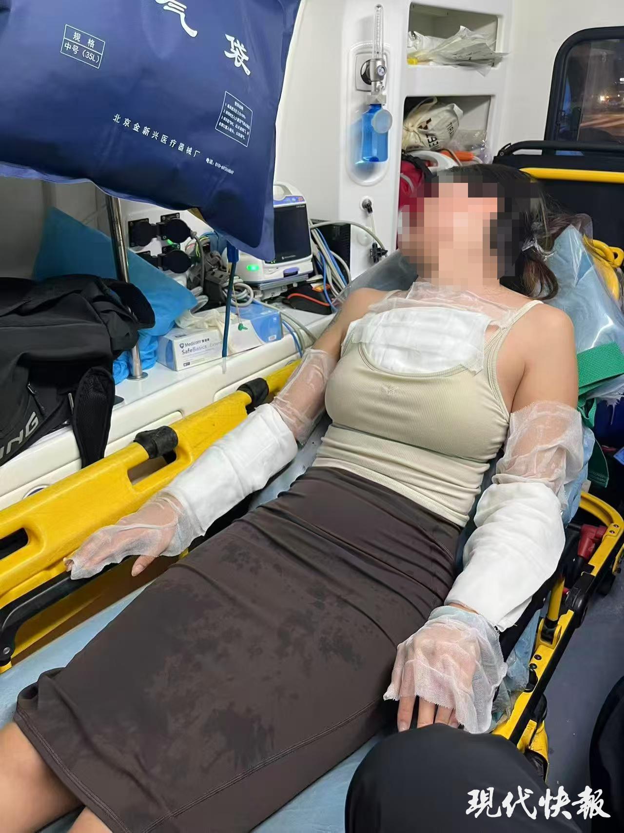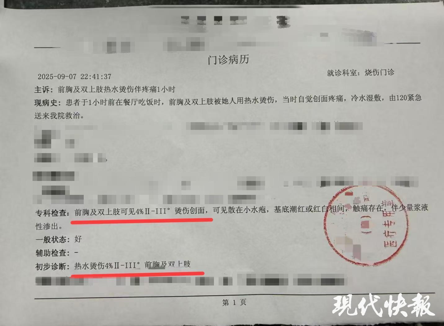 据了解,小沫遭服务员泼开水烫伤后,被120紧急送往当地医院治疗。9月7日晚10点41分,医院门诊病历显示,她被诊断为“热水烫伤4%Ⅱ-Ⅲ°前胸及双上肢”。目前,小沫已经返回北京,每隔两天去医院复查换药。