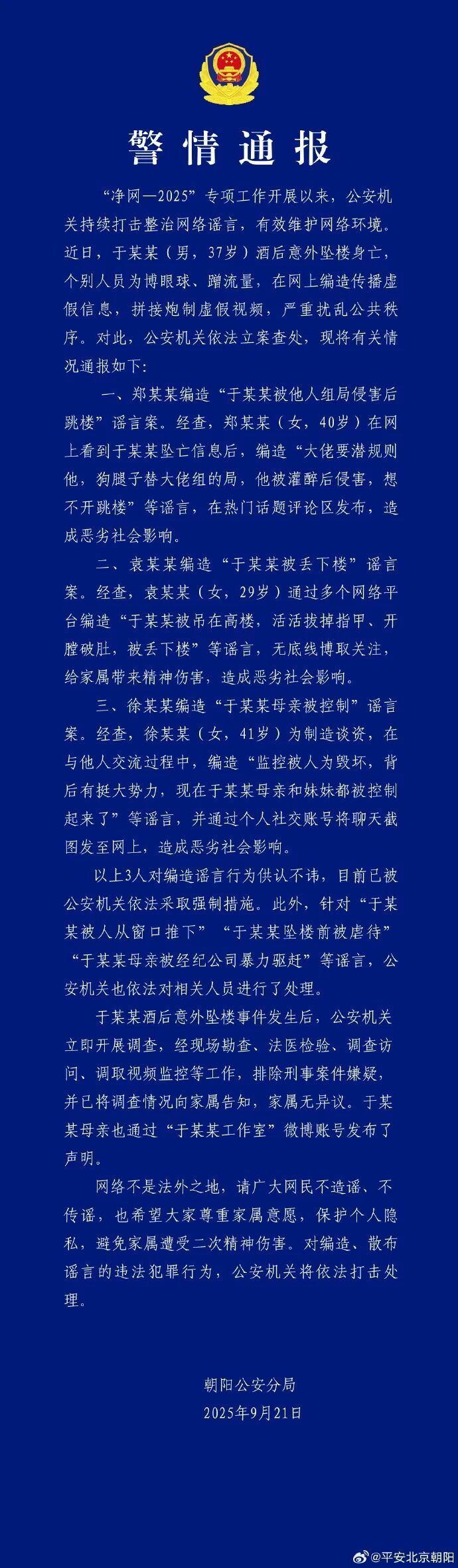 16日,于朦胧母亲通过工作室再次发文,称于朦胧系饮酒意外坠楼,公安已将调查情况向家属进行通报,后事已处理完。希望大家理性看待这一意外事件,不再进行猜测。