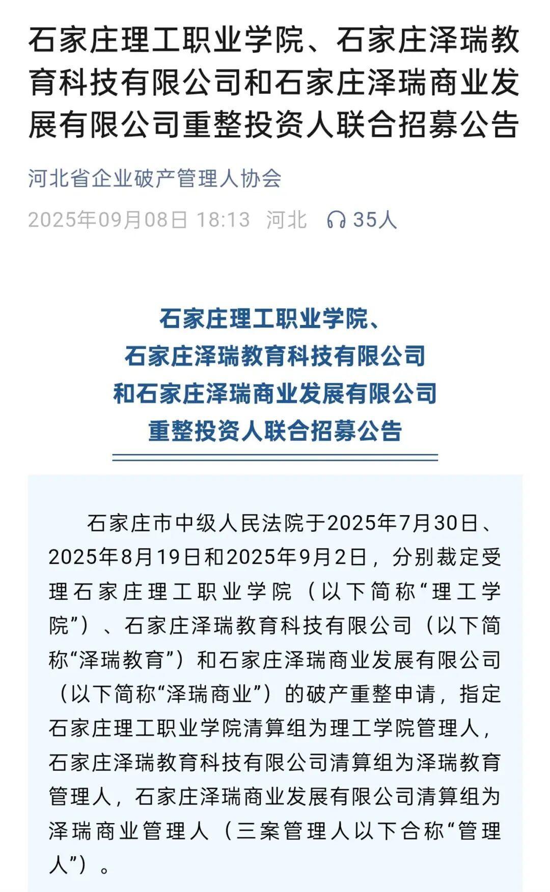 日前,河北省企业破产管理人协会发布消息,石家庄理工职业学院破产重整,并公开招募重整投资人,公告期届满至9月22日。