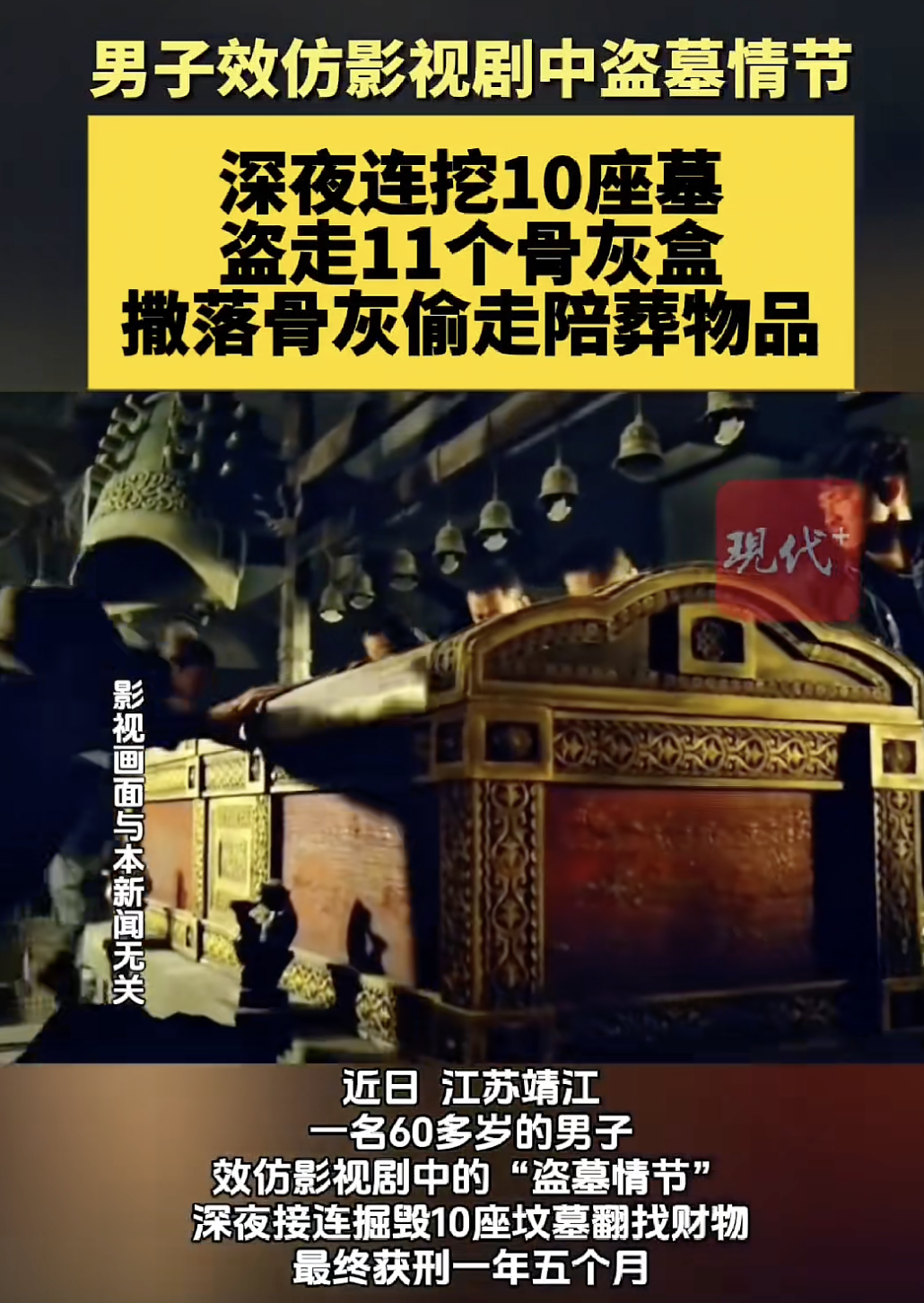 近日,江苏省靖江法院审结一起故意毁坏尸骨、骨灰案。一名60多岁的男子效仿影视剧中的“盗墓情节”,深夜接连掘毁10座坟墓翻找财物,最终获刑一年五个月。