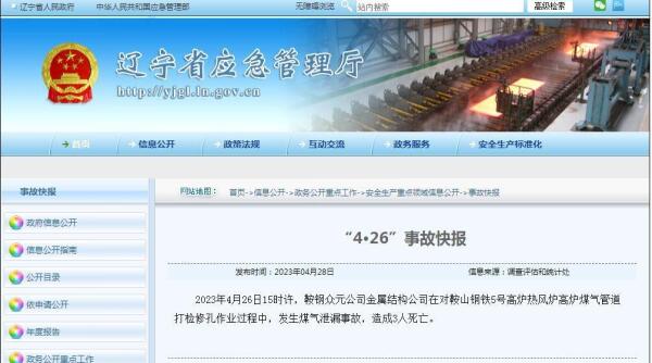 2023年4月26日15时许,鞍钢众元公司金属结构公司在对鞍山钢铁5号高炉热风炉高炉煤气管道打检修孔作业过程中,发生煤气泄漏事故,造成3人死亡。