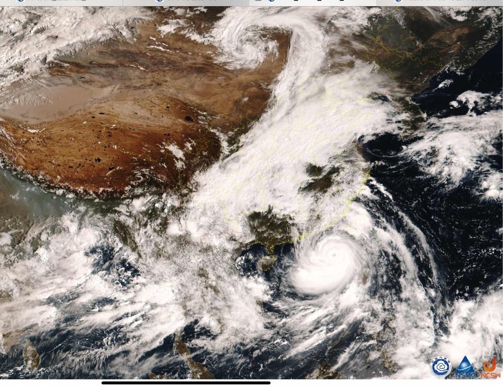 [color=]今日10时“桦加沙”的卫星云图,其体积庞大,预计将以每小时20-25公里的速度向西偏北方向移动。中央气象台官网截图