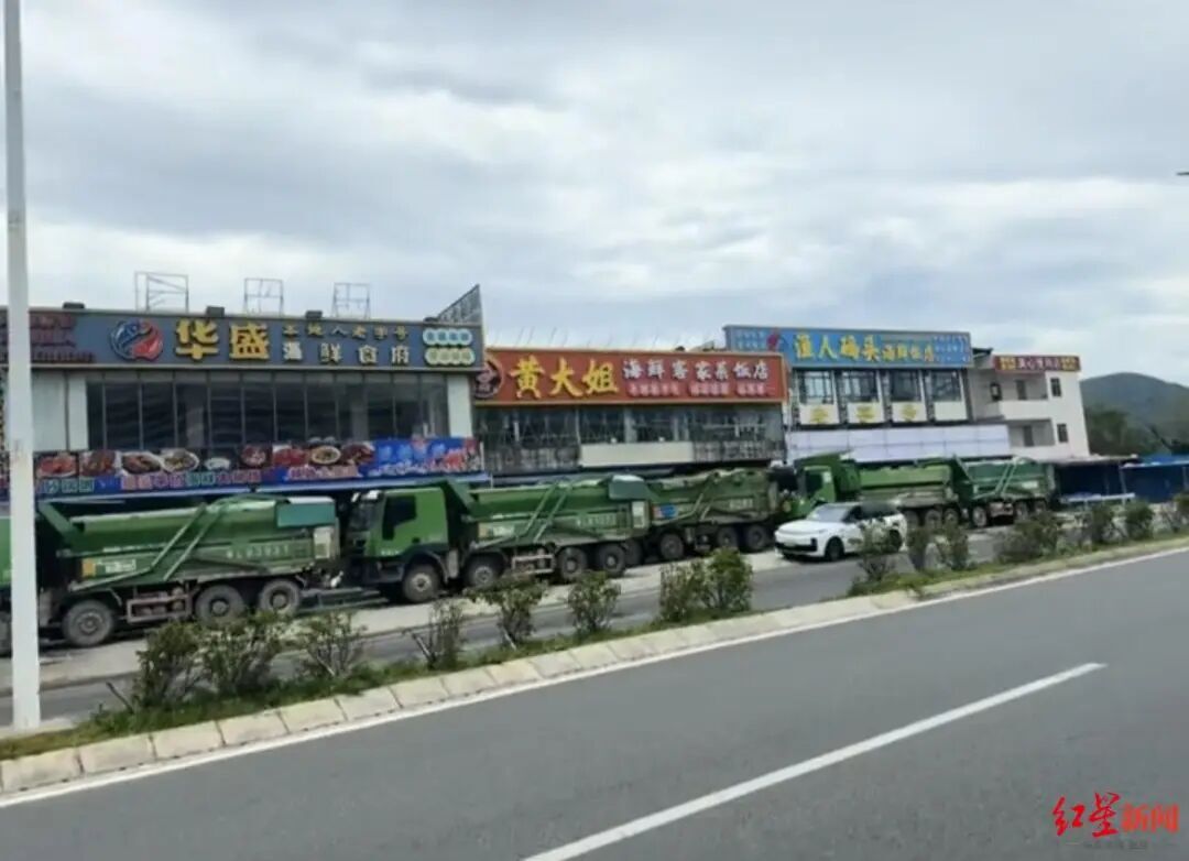 珠海一早茶店老板称,为减少损失,其23日已租下十几辆大卡车把店团团围住,该店刚装修好尚未营业,打算9月26日正式开业。在惠州双月湾,多家海鲜餐馆也租了大卡车停在店门口,十分震撼。