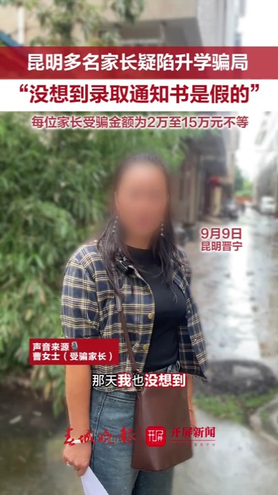 9月开学伊始,家住昆明市晋宁区的曹女士仍为女儿升学的事烦心不已。她向开屏新闻记者讲述受骗始末时难忍气愤与懊悔:“原本想寻找更好的教育条件,却让孩子因此错过民办初中自主招生的时机,只能就近入学。”一个月前,曹女士向中间人李某支付43000元用于“疏通关系”,对方承诺的“入读名校”却至今没有兑现。