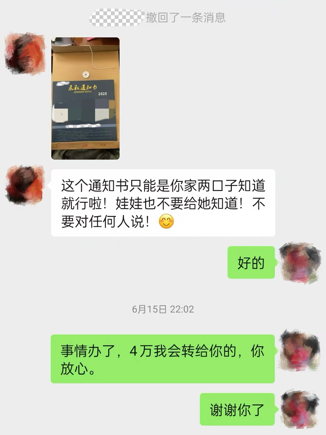 6月15日,“当时她发来两张照片,第一张是录取通知书封面,第二张印着我女儿的名字和学籍号。”曹女士向记者展示她与李某的聊天记录,点开照片原图,一封印有学校名称的通知书赫然在目。这份“录取通知书”是打动她的关键一击,曹女士最终痛下决心:交钱。
