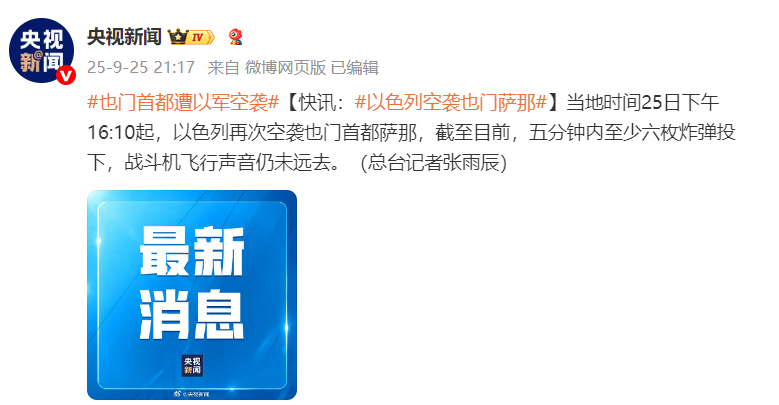据央视新闻消息:当地时间25日下午16:10起,以色列再次空袭也门首都萨那,截至目前,五分钟内至少六枚炸弹投下,战斗机飞行声音仍未远去。