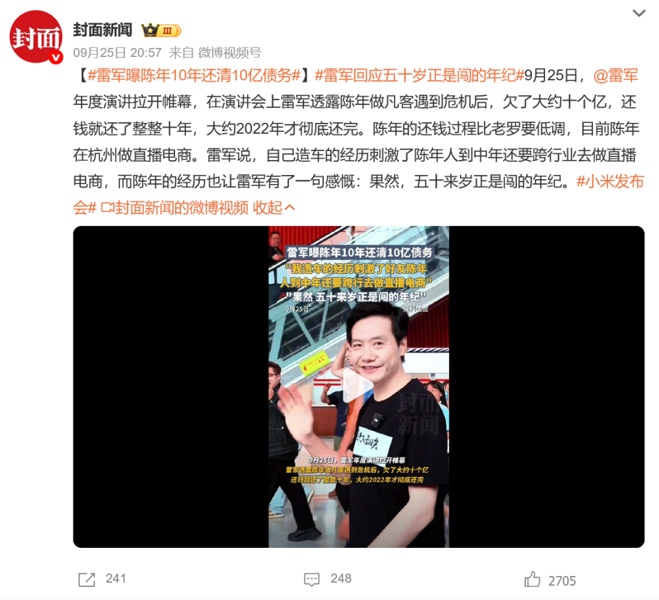 9月25日,雷军年度演讲拉开帷幕,在演讲会上雷军透露陈年做凡客遇到危机后,欠了大约十个亿,还钱就还了整整十年,大约2022年才彻底还完。随后,相关话题冲上热搜。