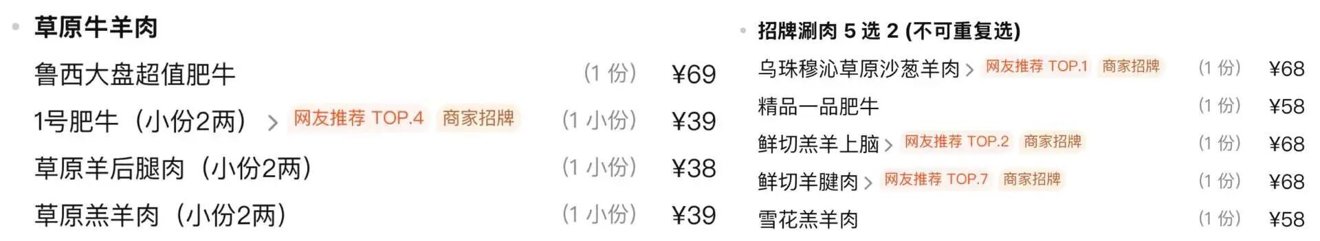 大多涮肉店是肥牛肥羊都有的|图源:大众点评@百年前门铜锅涮肉(前门总店);@八爷涮肉(王府井·故宫店)