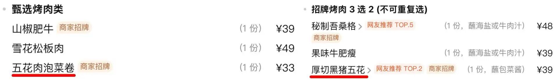 不少韩国烤肉店铺的烧烤肉类就有五花肉泡菜卷等,有的还会直接把猪肉切片烤制,不过相较于火锅的涮肉,韩国烤肉的猪肉要更厚,有的商家还会特别注明“厚切”。