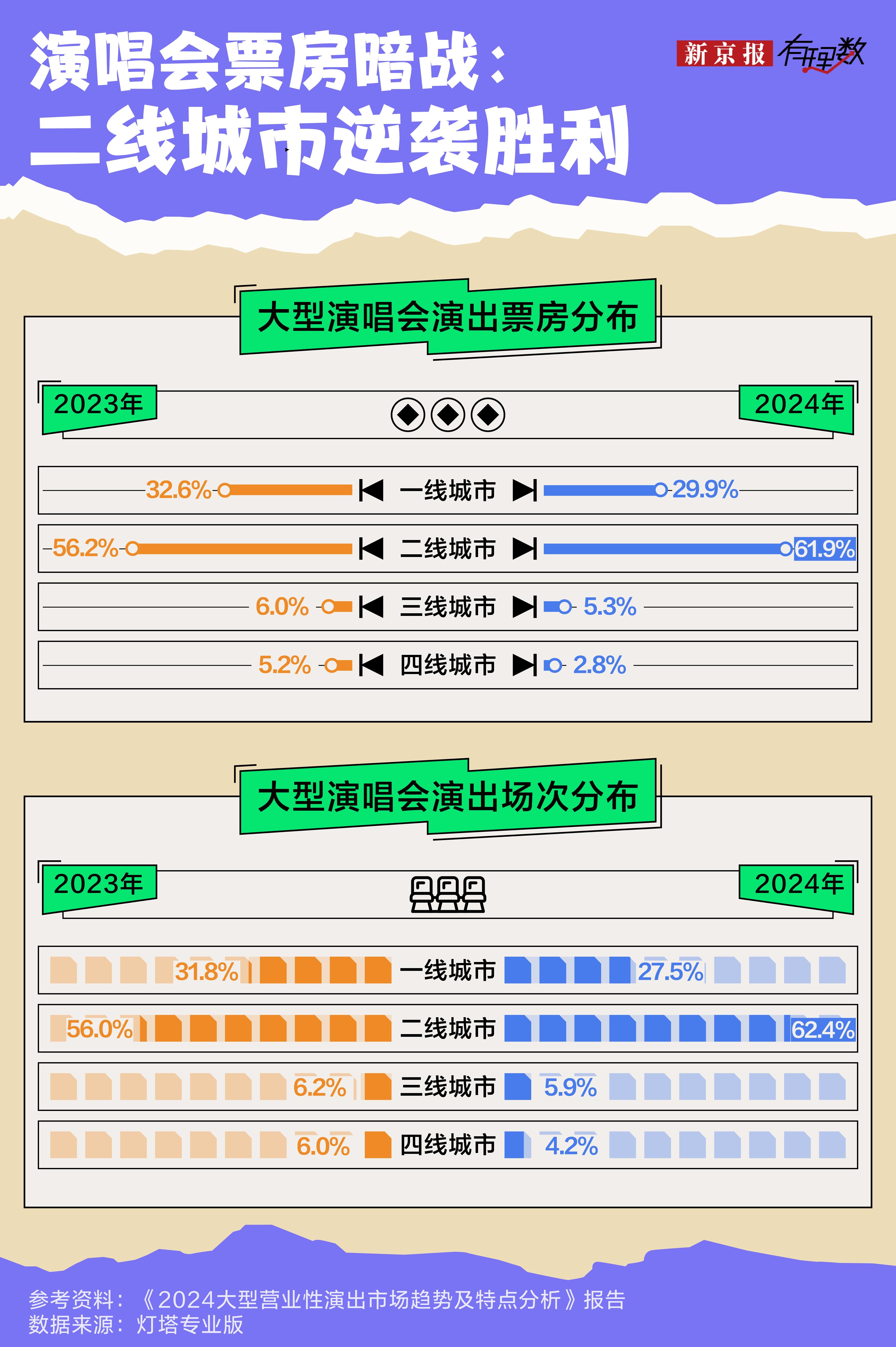 不过趋势上,大型演唱会正在加速下沉。2024 年,二线城市的场次和票房占比都超过了 60%,比 2023 年大幅提升。
