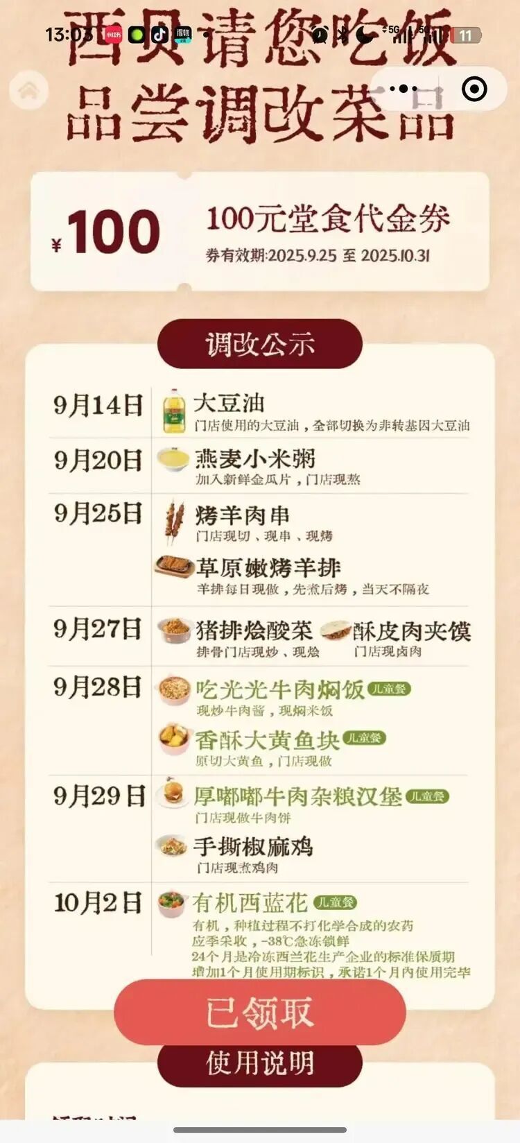 西贝正在以发放代金券的方式挽回流失的客人。记者就餐结束后,店员赠送了100元无门槛代金券,从次日起到10月31日均可使用。