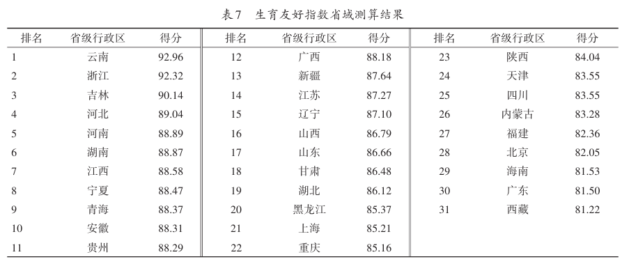 为避免单一赋权的局限性,研究通过德尔菲法和CRITIC法组合赋权,对各省(自治区、直辖市)进行测算与比较,研究结果显示,生育支持是衡量生育友好的关键因素,印证了“政策支持力度直接决定生育友好程度”的现实逻辑。