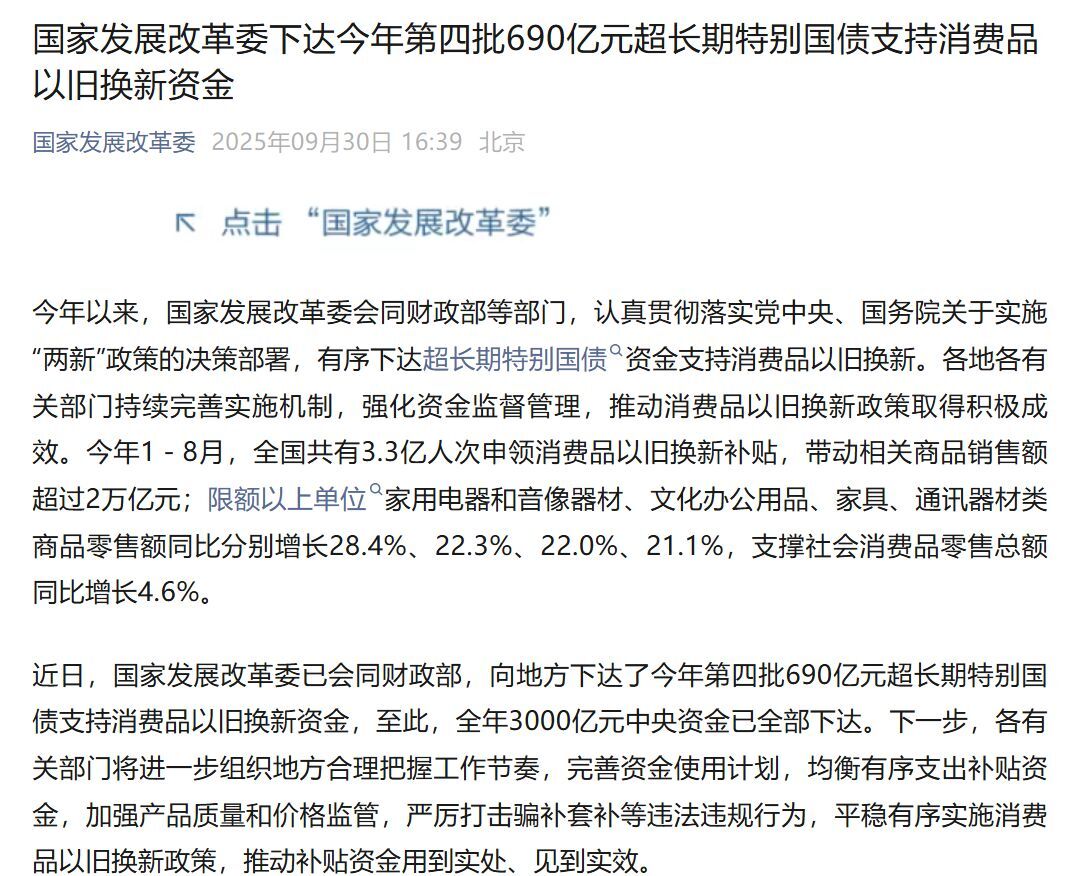 近日,国家发展改革委已会同财政部,向地方下达了今年第四批690亿元超长期特别国债支持消费品以旧换新资金,至此,全年3000亿元中央资金已全部下达。下一步,各有关部门将进一步组织地方合理把握工作节奏,完善资金使用计划,均衡有序支出补贴资金,加强产品质量和价格监管,严厉打击骗补套补等违法违规行为,平稳有序实施消费品以旧换新政策,推动补贴资金用到实处、见到实效。