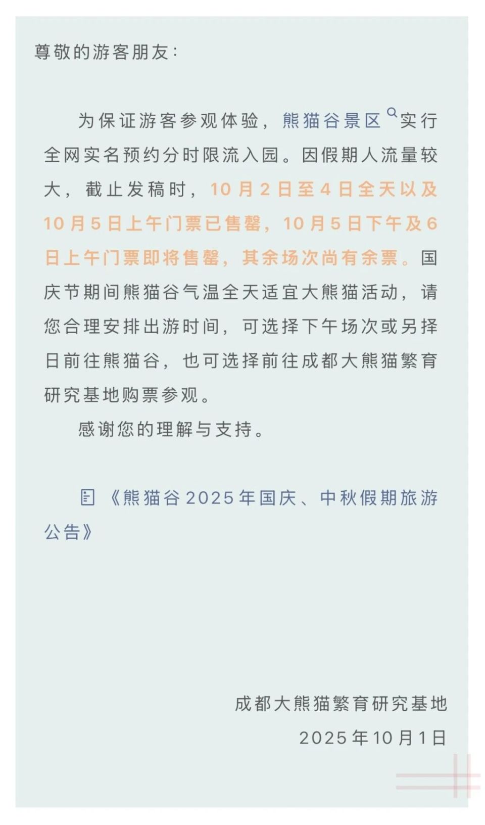 10月1日,成都大熊猫繁育研究基地也发布公告称,10月2日至10月4日全天以及10月5日上午门票已售罄,10月5日下午及6日上午门票即将售罄。
