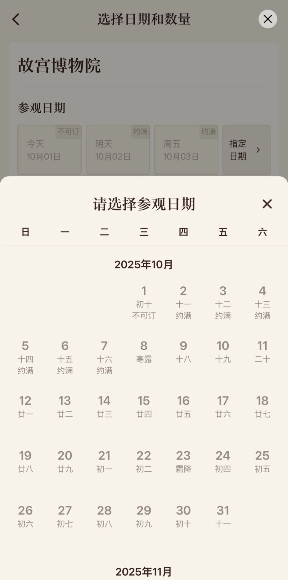 而截至发稿,记者搜索发现,包括中国国家博物馆、故宫博物院、陕西历史博物馆、南京博物院、湖南博物院等热门博物馆等可预约时段内的门票均已约满或售罄。