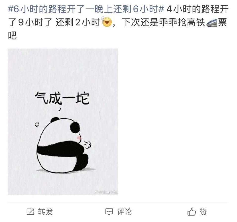 还有网友表示:“所以我今天凌晨三点就出发了。”“4小时的路程开了9小时了,还剩2小时,下次还是乖乖抢高铁票吧。”