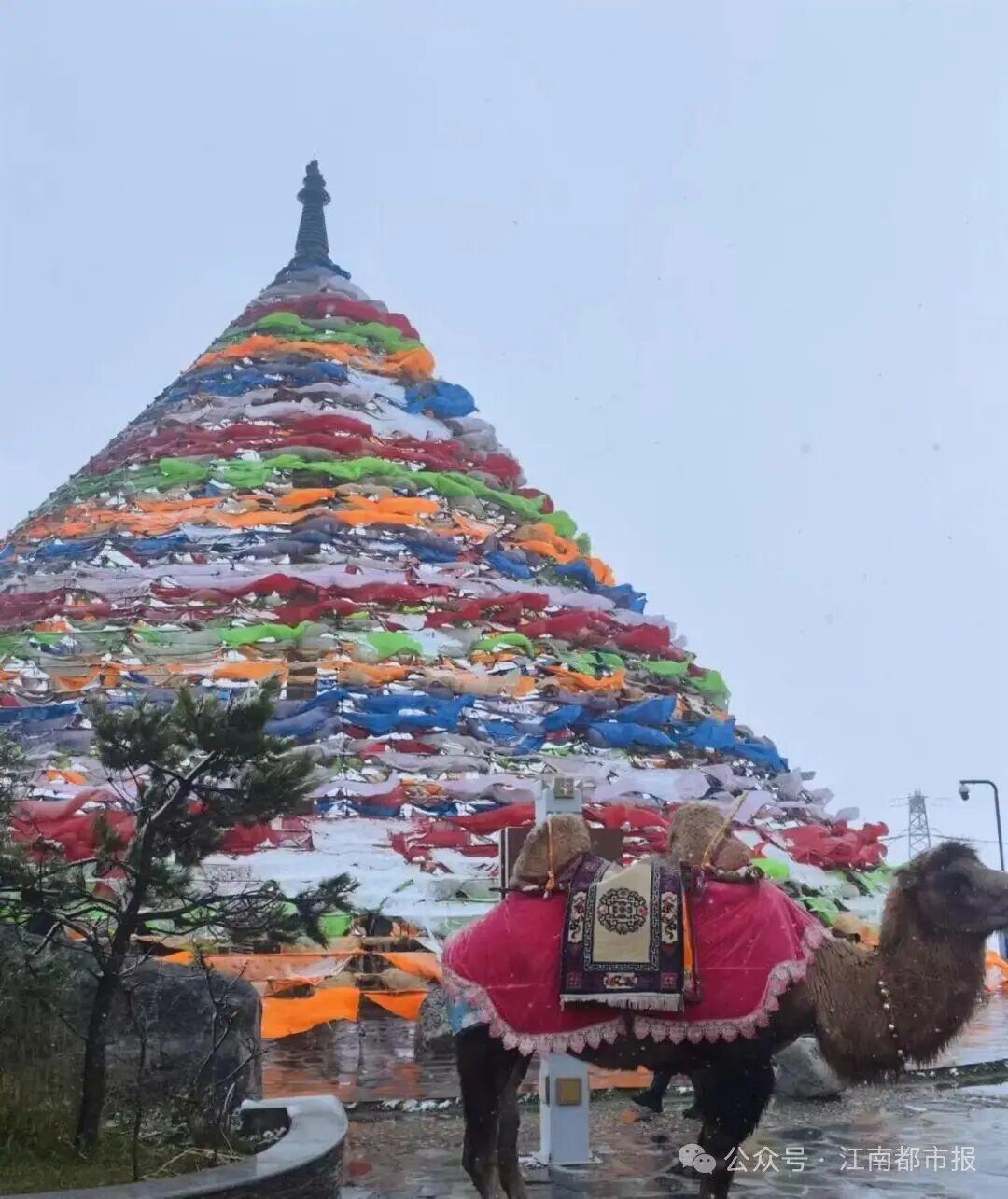 “下雪不会影响游客参观。”日月山景区工作人员告诉极目新闻记者,目前山上草坪已被积雪覆盖,路面基本无积雪。国庆期间游客数量比平时更多,山上气温较低,只有几度,景区内有披肩、冲锋衣等防寒用品售卖。