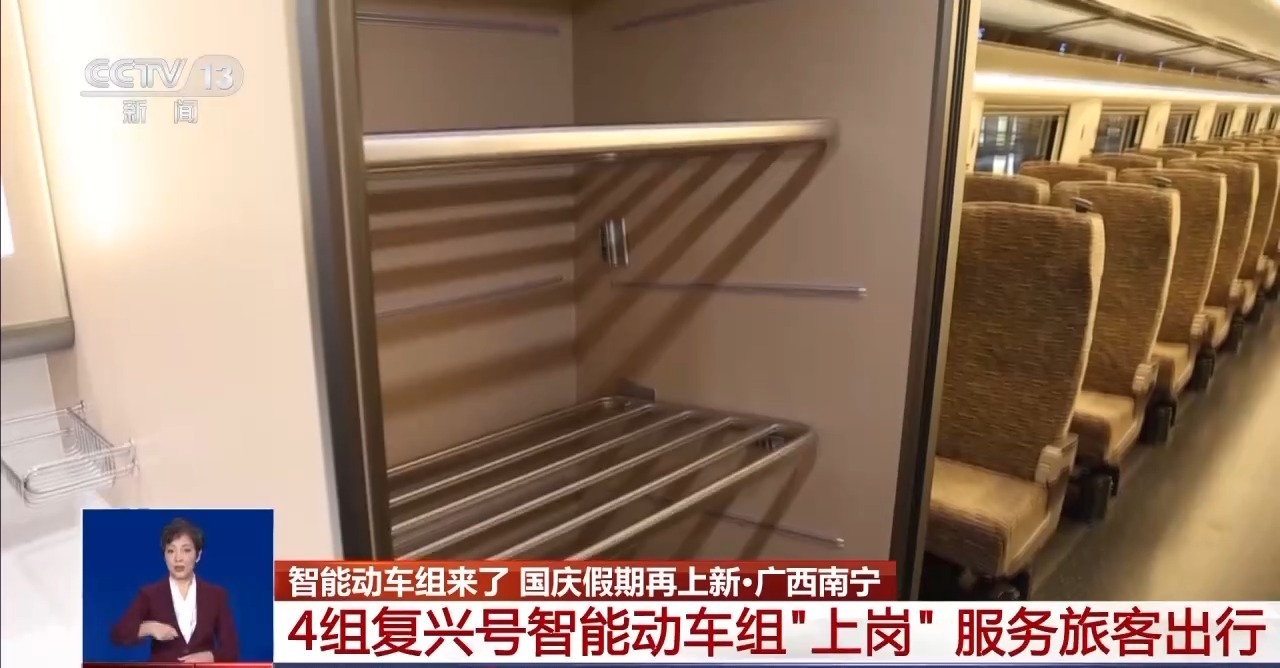 为应对激增的出行需求,国铁南宁局新配备了四组复兴号智能动车组,于9月30日上线载客运行。CR400AF-S复兴号智能动车组全列共8节车厢,定员619人,而最受旅客关注的,当属新车在服务体验上的 “贴心升级”。