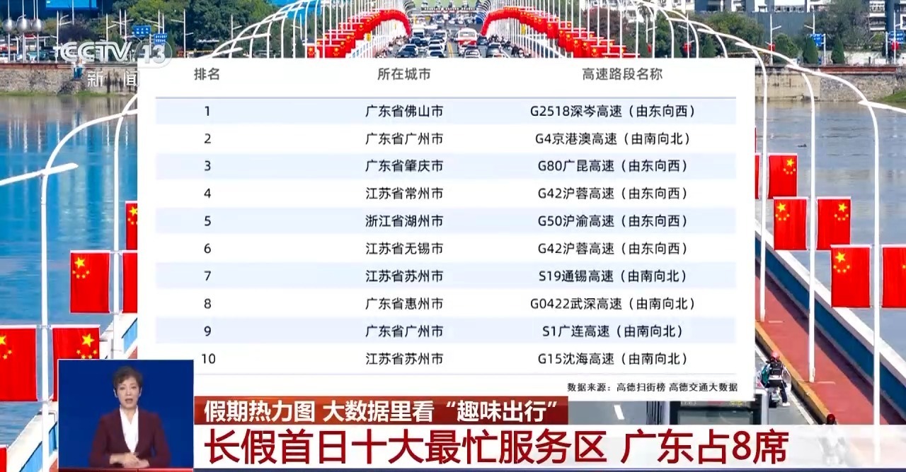 有网友说,聪明人都提前出门了。交通大数据显示,10月1日0点至10点,全国十大繁忙出程高速路段中,长三角与粤港澳大湾区各占一半。其中,广东的高速、火车站、机场等繁忙程度全面领跑全国。同时段全国十大繁忙高速服务区中,广东占8席,江苏占2席,广东人的长假出门热情领跑全国。