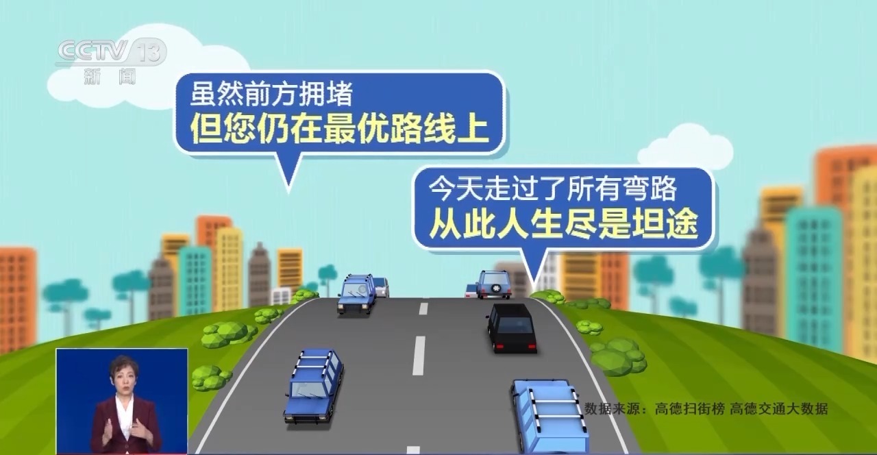 “虽然前方拥堵,但您仍在最优路线上”“今天走过了所有弯路,从此人生尽是坦途”,导航的“劝堵”金句与长假出行实时相伴。