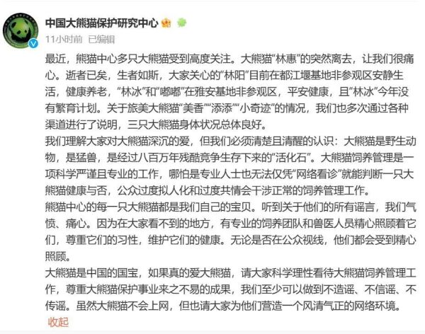 我们理解大家对大熊猫深沉的爱,但我们必须清楚且清醒的认识:大熊猫是野生动物,是猛兽,是经过八百万年残酷竞争生存下来的“活化石”。大熊猫饲养管理是一项科学严谨且专业的工作,哪怕是专业人士也无法仅凭“网络看诊”就能判断一只大熊猫健康与否,公众过度拟人化和过度共情会干涉正常的饲养管理工作。