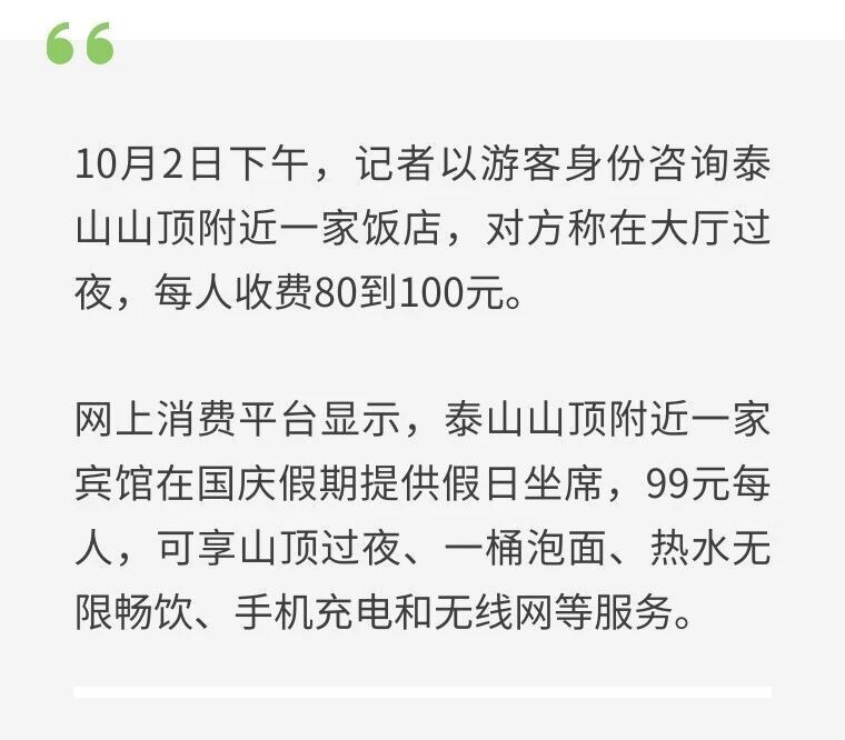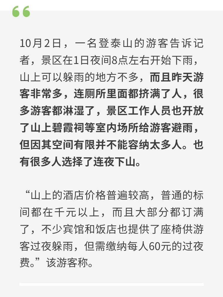 10月2日,有多名爬泰山的游客发视频称,国庆长假期间,来登山的人非常多,10月1日夜间到2日白天,泰山景区下起了小雨,并伴有大风天气,夜间温度也很低,很多游客躲在山上厕所或者收费的饭店内躲雨过夜。第二天早上,雨还在下,游客也没有看到日出。