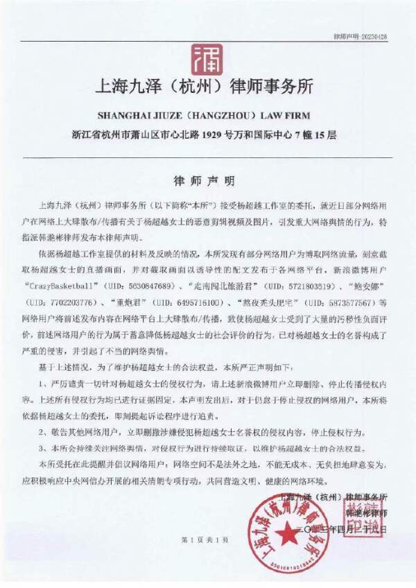 为了维护杨超越的合法权益,也严厉谴责侵权行为,并要求停止传播侵权内容,还会对侵权行为进行取证,以维护杨超越的合法权益。最后也希望大家共同营造文明、健康的网络环境。
