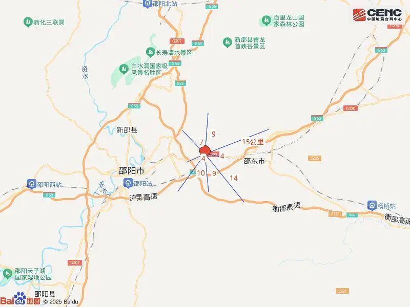周边县城:震中距邵东市11公里、距双清区15公里、距北塔区19公里、距新邵县19公里、距大祥区21公里,距邵阳市18公里,距长沙市162公里。