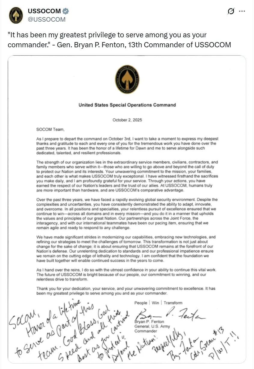 资料显示,芬顿于1987年加入美军,曾任国防部长高级军事助理、印太司令部副司令。自2022年8月,芬顿就任美国特种作战司令部第13任司令,该部门负责组织、训练并指挥美军在全球范围内的特种作战部队,以执行各类战略任务。
