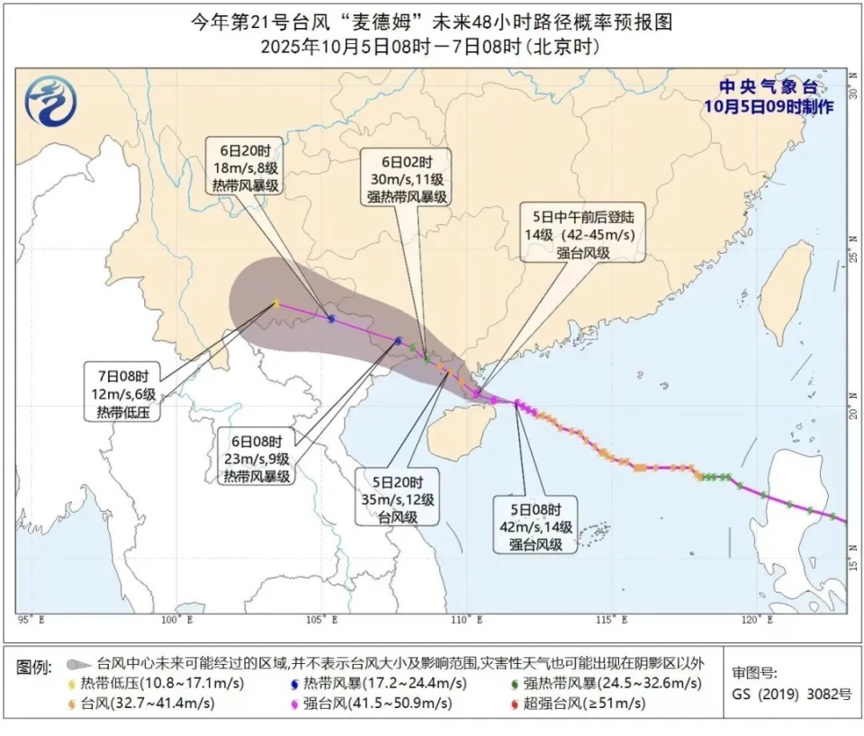 10月5日,今年第21号台风“麦德姆”的中心已于今天14时50分前后在广东省徐闻县东部沿海登陆,登陆时中心附近最大风力14级(42米/秒,强台风级),中心最低气压965百帕。