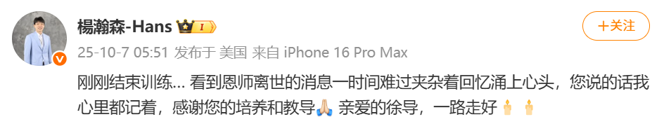 杨瀚森今晨发文缅怀:“刚刚结束训练……看到恩师离世的消息,一时间难过夹杂着回忆涌上心头,您说的话我心里都记着,感谢您的培养和教导🙏。亲爱的徐导,一路走好🕯️🕯️。”