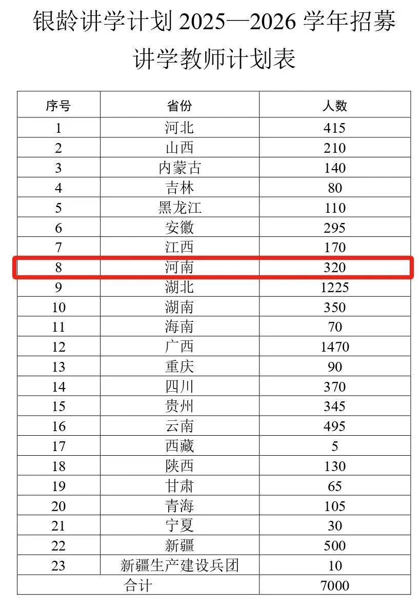 近日,教育部、财政部发布关于做好2025年银龄讲学计划有关实施工作的通知,计划在2025年义务教育阶段招募7000名讲学教师,旨在充分利用退休教师专业优势、经验优势,加强新时代乡村教师队伍建设,推动巩固脱贫攻坚成果同乡村振兴有效衔接。其中,河南将招募320名。(教育部官网、新华社)