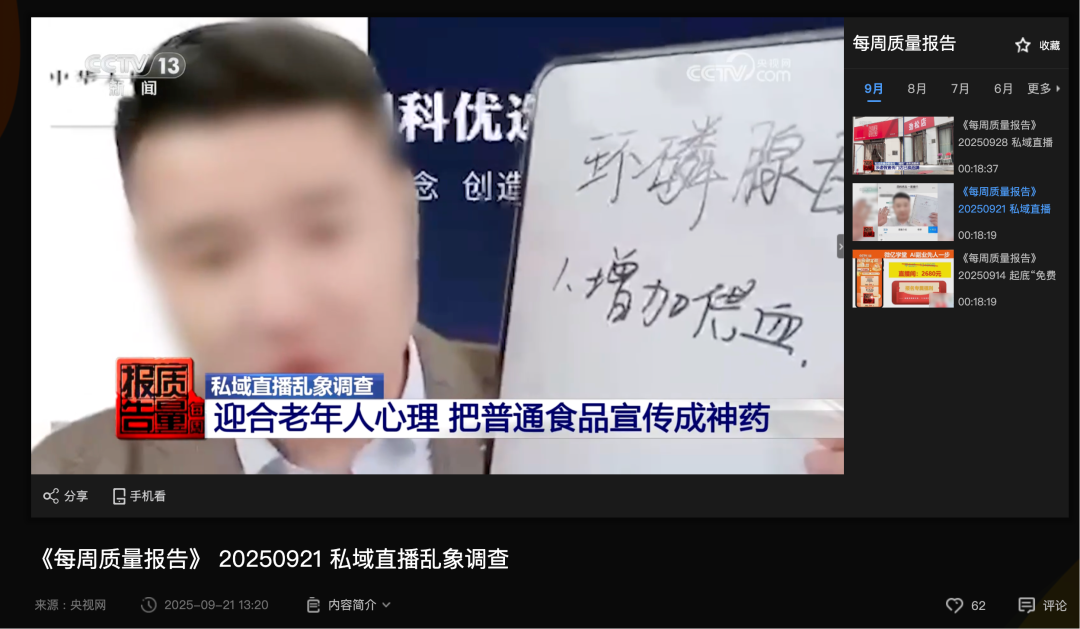 特别是在预付费、会员制等敏感领域,此类风险尤为突出。惊蛰研究所此前在《315洞察丨谁在收割“网瘾老年”?》中,就报道过“X科优选”私域直播间通过会员模式销售高价食品、调味品。而在今年9月,同一家企业也被央视新闻《每周质量报告》栏目曝光。
